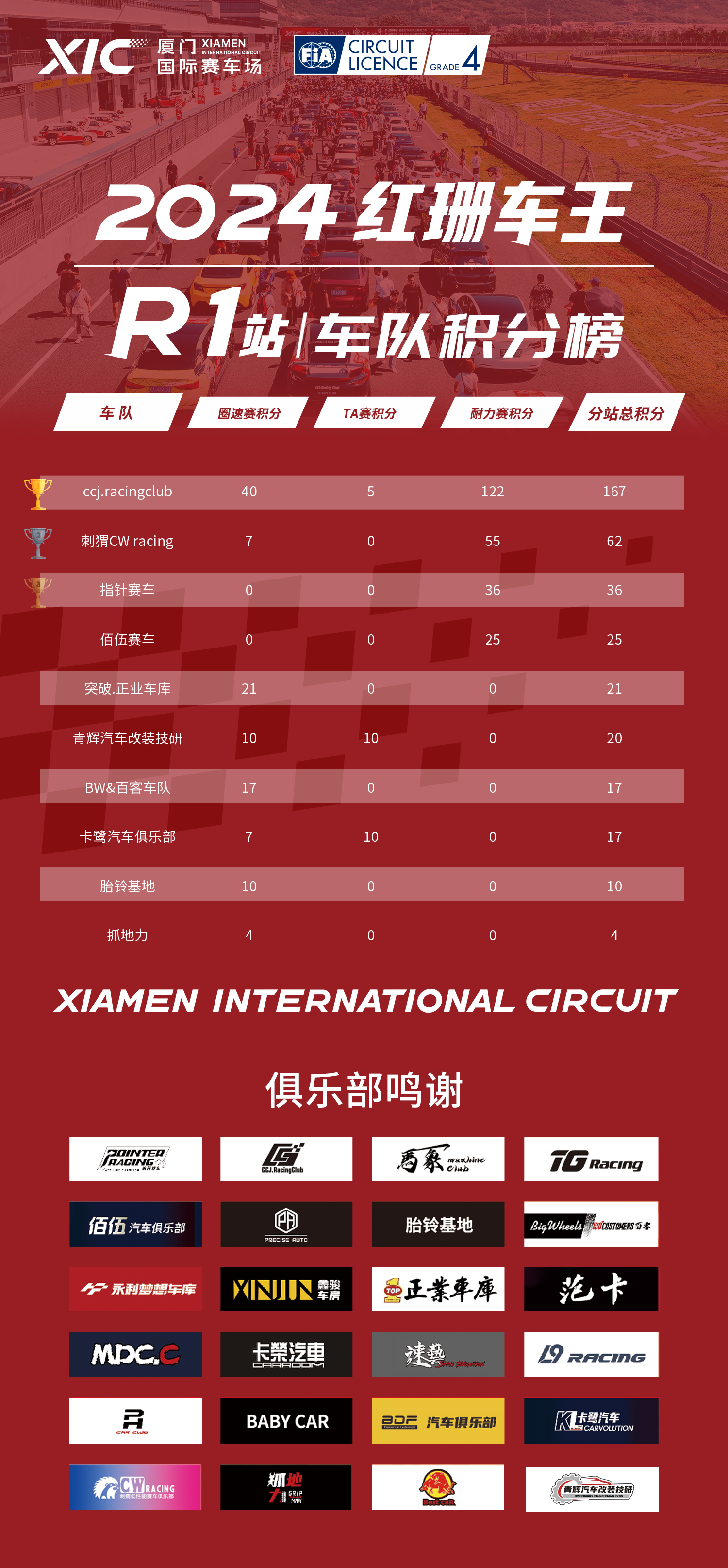 2024红珊车王R1站车队积分榜