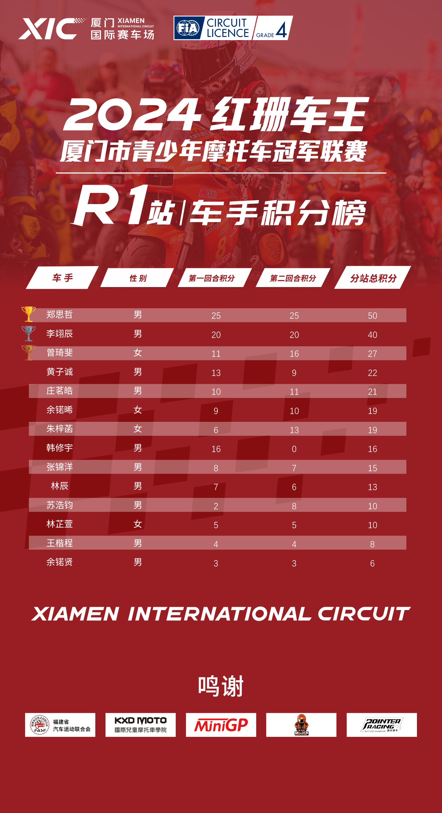 2024红珊车王R1站青少年摩托车冠军联赛积分榜