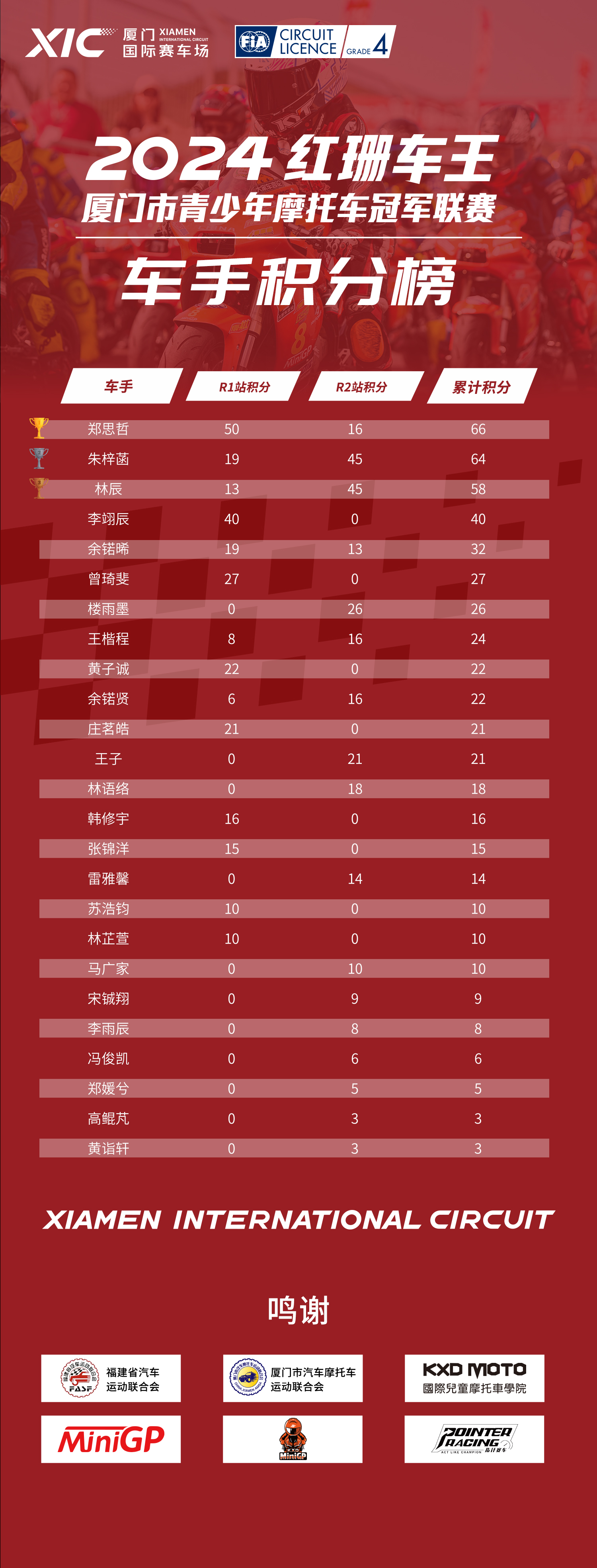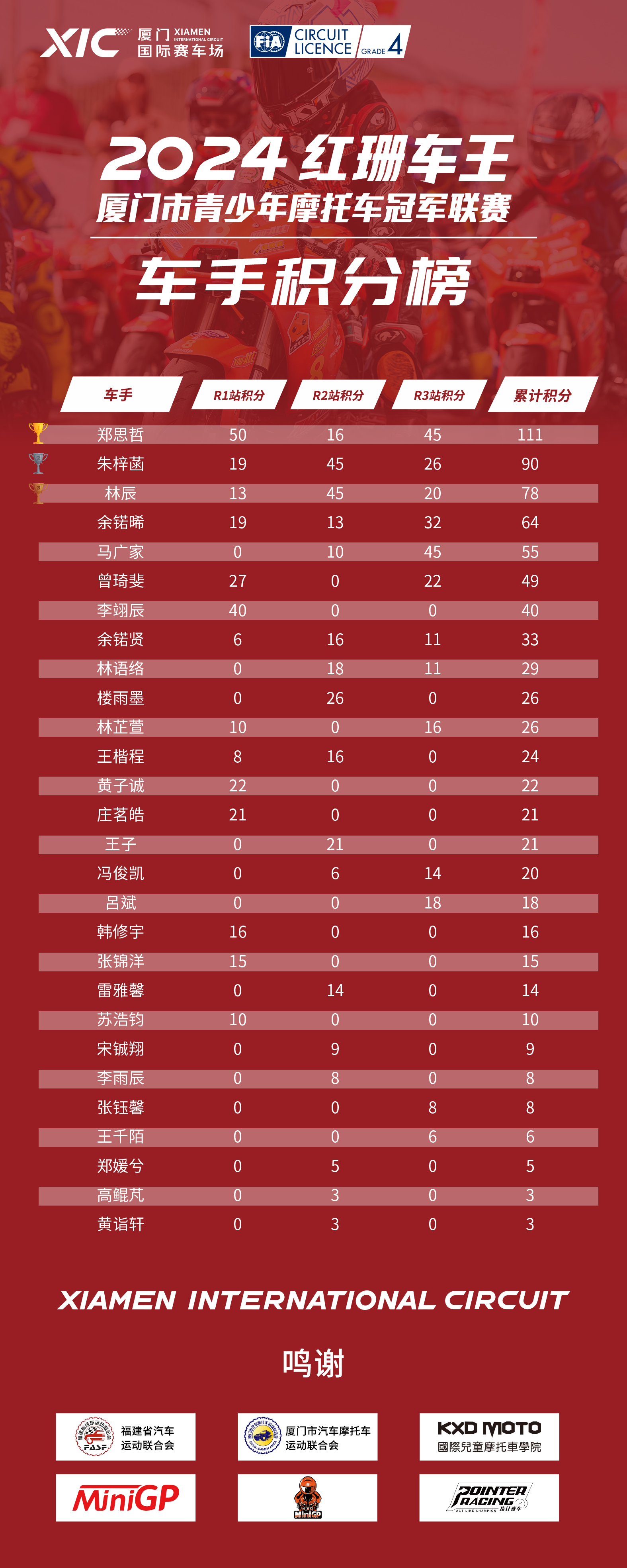 2024红珊车王R3站青少年摩托车冠军联赛积分榜