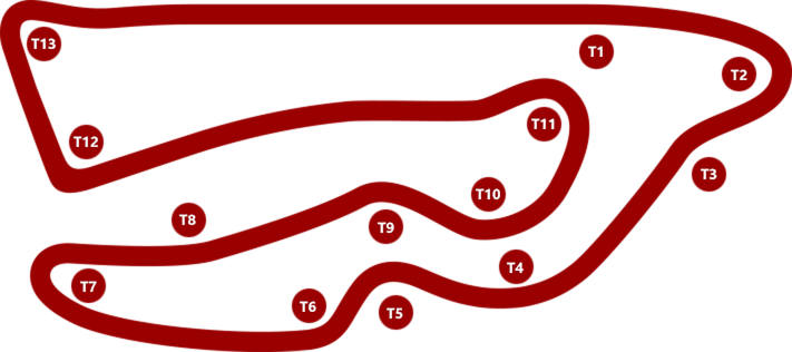 赛道全长1.82公里,顺时针方向;共设13个弯道,赛道宽度12米-21.6米,赛道中心最小半径13.5米,最大直线长度286.99米;最大高低落差11米,共设5个上坡,4个下坡,最大上坡坡度为3.96%,最大下坡坡度为6.41%,最高时速可达258km/h